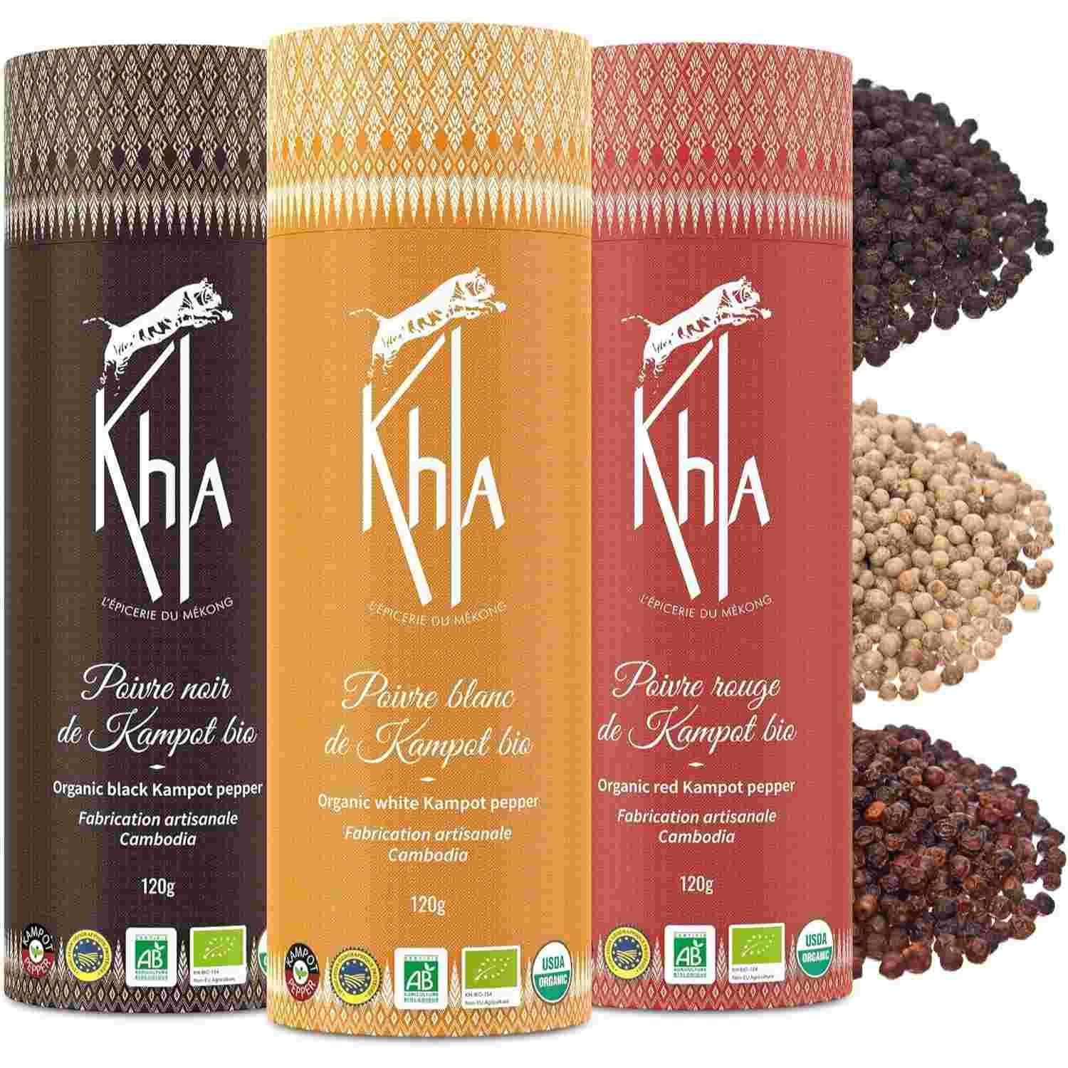 : Le poivre de Kampot se présente sous des grains luisants, d’un noir intense pour le poivre noir, d’un rouge éclatant pour le poivre rouge, et d’un blanc nacré pour le poivre blanc.